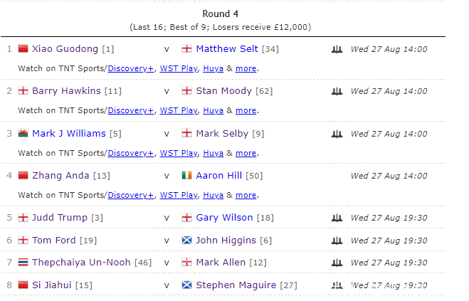 历程强烈争夺,共有赵心童、肖国栋、张安达、斯佳辉、雷佩凡、袁念念俊等9名中国选手晋级到32强。丁俊晖在第二个比赛日与18岁小将斯坦-穆迪的比赛中,以3-5被淘汰出局。来到第四个比赛日,周跃龙对阵斯坦-穆迪,他以3-5也输给敌手。