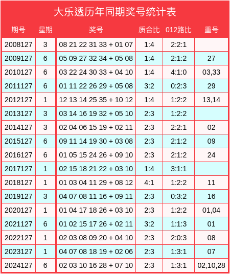后分袂析:积年同时中后区的大小比为21:13,本期瞻望开出小少许后区号码:01、05。